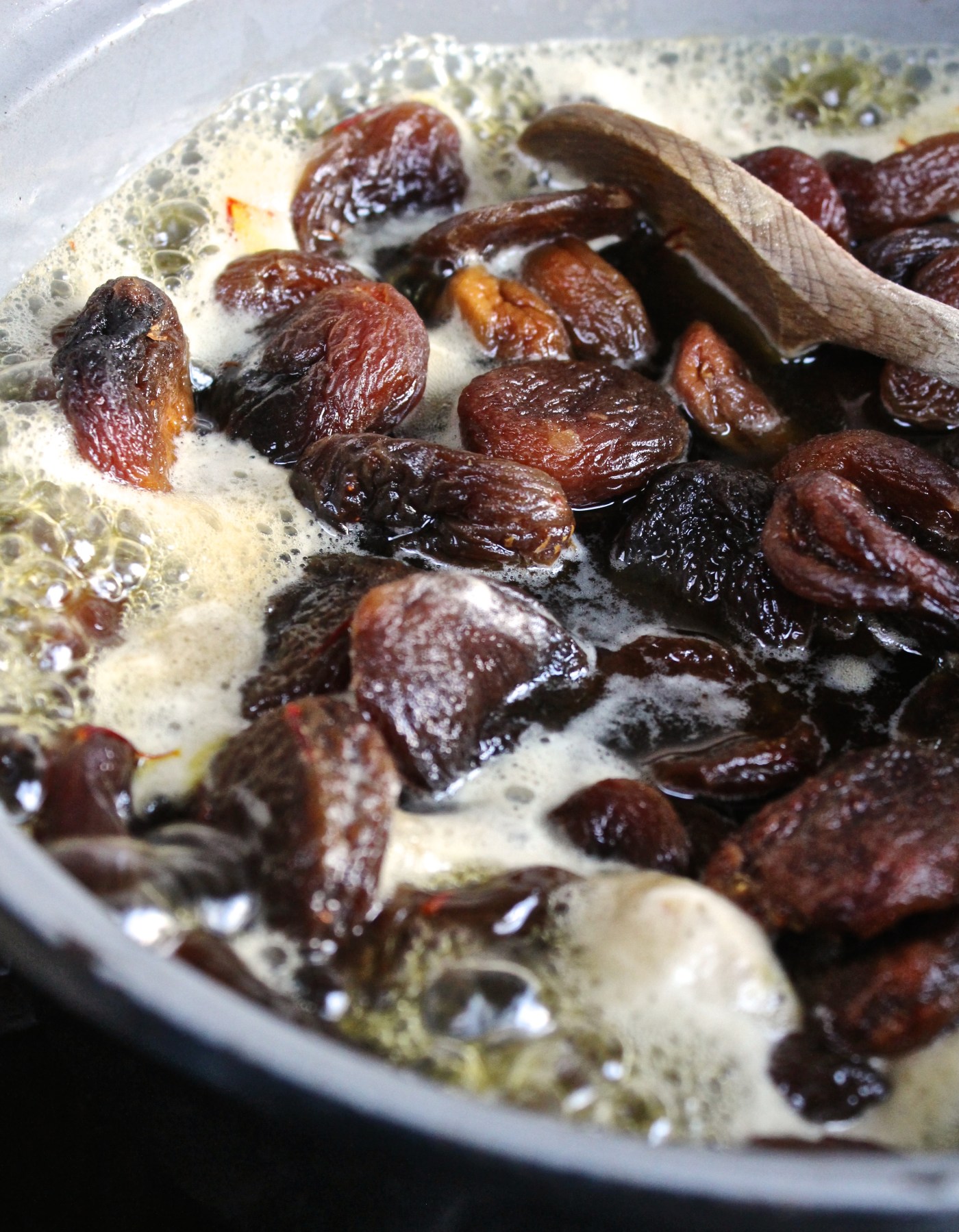 – Maak de abrikozenmouse: breng de abrikozen, saffraan, rijststroop, aan de kook met 200 ml water, op laag vuur 30 minuten, met deksel, laten sudderen. Neem van het vuur en doe citroensap erbij. Pureer het geheel, met de staafmixer, tot een gladde massa.Laat het helemaal afkoelen (gaat sneller in een platte brede schaal). Voeg als het koud is de crème fraiche erbij.