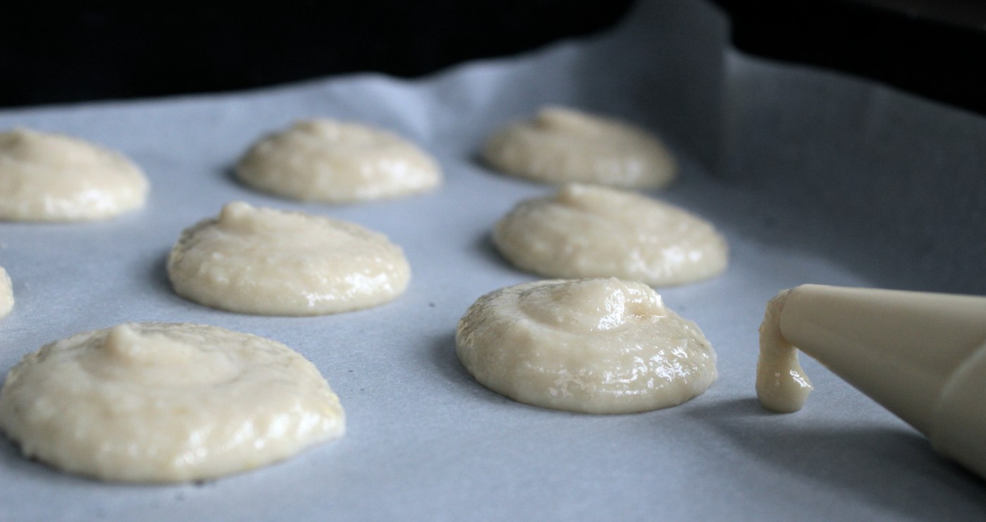 Maal de amandelen met de suiker en het eiwit tot een glad beslag. Breng op smaak het amandelextract. Schep het beslag in een spuitzak met een gladde spuitmond. Spuit doppen op een met bakpapier beklede bakplaat. Regelmatig spuiten en houdt +/- 2 vingerdikte afstand tussen de koekjes. Druk de pieken van het beslag iets plat met een natte vinger. Bak de koekjes in circa 10 minuten goudbruin en gaar.
